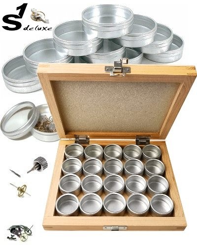 Coffret en bois avec 20 boîtes de rangement en aluminium avec couvercles verre qui conviennent parfaitement au stockage de pièces détachées pour montres par exemple pour les joints, les vis, les tiges de remontoir, les ancres, les barrettes à ressort et bien plus encore. Dimentsions des boîtes : Ø 32mm, hauteur 18mm. Dimensiones de la boîte : 18,5 x 15,3 x 3 cm.