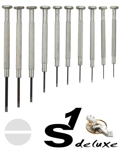 10 tournevis d'horloger S1 DELUXE ECO, tailles: 0,4 à 1,8 mm. Lame fixe. Tournevis pour les réparations de montres.