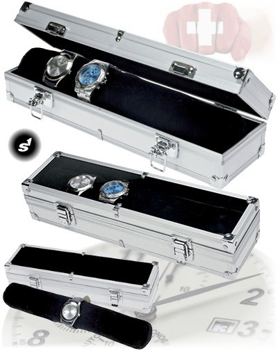 Une mallette élégante et moderne en aluminium avec compartiments et coussins pour 7 montres. Mallette FASHION SEVEN en Aluminium avec vitre transparente en plexiglass. Interieur en Velours noir. Dimensions 330 x 75 x 90 mm. Un petit mallette de montres peu coûteux pour transporter ou ranger des montres-bracelets.