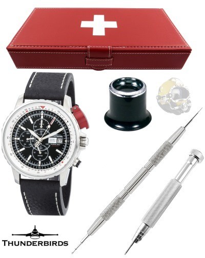 Sportif horloge aviateur Thunderbirds STEELS 23 avec poli logements en acier et un diamètre de 43mm. Mouvement automatique avec écran multifonction (date, jour, année et 24 heures), calibre Seagull TY 2867 avec de 20 rubis, précision ajustement +10 / -3 secondes / jour, inquiétude 21800 A / h, réserve de marche 32h. Détails: massif boîtier en acier inoxydable, saphirietes DFC spécial verre minéral (résistance aux rayures et les chocs fête de verre), massive sol en acier inoxydable polie, massive efficaces couronne est marquée par le logo, couronne et 2 joints à double poussoir, front avec la couronne de protection, heures / minutes / secondes et indices avec lumineux Superluminova, chiffres feuille noir mat, lunette pivotante avec 2e fuseau horaire et l'échelle 60, décentralisation ya des centre de la feuille de chiffres, étanche à 3 ATM selon la norme DIN 8310 (30 m / 3 bar). Diamètre: 43 mm sans couronne, d'un châssis épaisseur: 14 mm, bande impulsion: 22 mm, le poids de l'horloge: 120 gr. Cette boîte est livrée avec le contenu suivant: 1x bracelet en cuir noir avec couture blanche, 1x Pointeau de pose/dépose fabriquée en Suisse, 1x Loupe d'horloger, lentille en verre avec lunette.