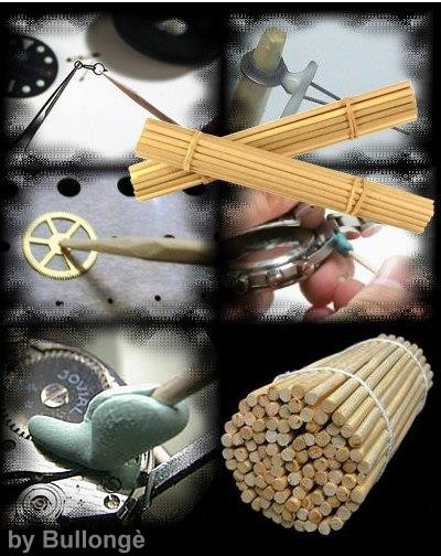 Ces baguettes de nettoyage en bois de 3mm permettent une grande variété d'utilisations: nettoyage direct de nombreuses pièces de montres (appointées à l'aide d'une lame de rasoir ou d'un couteau, elles vous permettront d'atteindre des endroits difficiles) ou pour piquer un peu de gomme de nettoyage Rodico. Elles peuvent être humectées d'huile ou d'agent polissant et permettent le maintien de diverses pièces. A l'inverse des expédients en métal, un endommagement de la montre est ici quasiment exclu.